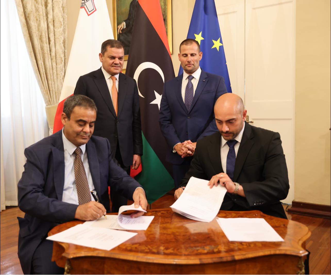 توقيع اتفاقية بين ليبيا ومالطا في قطاع المواصلات خلال مؤتمر صحفي لرئيس الحكومة عبد الحميد الدبيبة مع نظيره المالطي الدبيبة من مالطا: اتفقنا مع مالطا على زيادة حجم الاستثمارات وجرى التوقيع على اتفاقية بين وزارتي المواصلات