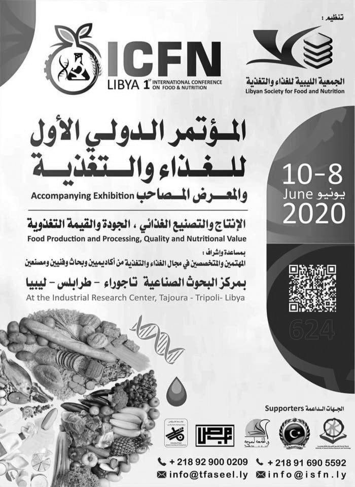 ينعقد المؤتمر الدولي الاول للغذاء والتغذية خلال الفترة من 8 إلى 10 يونيو 2020 للإنتاج والتصنيع الغذائي ، الجودة والقيمة الغذائية ، بمساعدة واشراف المهتمين والمتخصصين في مجال الغذاء والتغذية من اكاديميين وبحاث وفنيين ومصنعين . ويهدف المؤتمر لتطوير الغذاء في ليبيا ونشر الثقافة الغذائية ، وإبراز أهمية استخدام التقنيات الحيوية في تطوير الصناعات واستعراض التوجهات والتقنيات الهندسية الحديثة في الانتاج . وتحديد المشاكل التي تعترض التصنيع الغذائي في ليبيا واستعراض الحلول الممكنة وتقييم الوضع الرقابي على السلع والمنتجات ، واستنباط هيكلية لنظام رقابي فعال يضمن رقابة محكمة لضمان امن وسلامة المنتجات المستوردة والمحلية ، وتحديد وتقنين المضافات الغذائية والتعريف بدور اخصائي التغذية ودوره في العلاج الغذائي للمرضى ، والتعريف بأهمية التشريعات الغذائية لضمان سلامة الغذاء واستعراض التجارب الناجحة والاستفادة منها في تطوير تقنيات التصنيع . وتتضمن محاور المؤتمر على عدة من بينها : تقنيات تصنيع حفظ وتحليل الاغذية ، منها مواد التعبئٍة والتغليف وصلاحيته والتصنيع الغذائي ومضافات الاغذية اهميتها والتلوث الغذائي بقايا المبيدات والعقاقير الطبية , التغذية والتغذية العلاجية منها الاستراتيجية العامة للغذاء وتوعية المجتمع بالعادات والمظاهر الغذائية السلبية ، ودور أقسام التغذية العلاجية في المؤسسات الصحية والسمنة وعلاقتها بالتغذية والنشاط البدني ، والتعريف بالتفاعل الداخلي بين الغذاء والدواء وتأثيره في العلاج النمط الغذائي على المرضى وعلاجهم . كما يتضمن المحور الثالث : اقتصاديات إنتاج واستهلاك الغذاء مؤشرات الأمن الغذائي سياسات التجارة المحلية والخارجية الدعم السلعي في توفير غذاء امن ، والتعبئة الآلية واقتصاديات الأغذية الزراعية وتحقيق الاكتفاء الذاتي ، وتسويق المنتجات الزراعية وسلاسل القيمة الغذائية . أما المحور الرابع يتضمن على الزراعة المستدامة فوائدها وطرائقها أساليب وتقنيات الزراعة العضوية الآثار البيئية والصحية لاستعمال المبيدات والاسمدة المعدنية ، والرفع من كفاءة استخدام الأسمدة ومياه الري ، والفرص المستقبلية للنباتات الطبية والعصرية . والمحور الخامس يحتوى على التشريعات القانونية وحماية المستهلك ، منها الجرائم الاقتصادية فيما يتعلق بالمنتجات الغذائية ، وتوعية المستهلك بمفهوم الجودة وسلامة الغذاء والأغذية المحورة وراثيا وتأثيرها الصحي والنفسي على المستهلك والاغذية الحلال الطرق الحديثة للتأكد منها والكشف عنها .