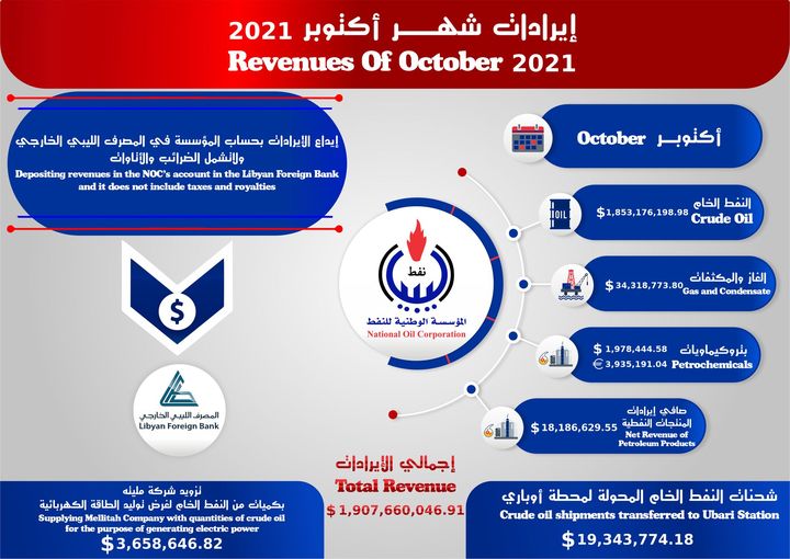 أعلنت المؤسسة الوطنية للنفـط أن صافي إيرادات شهر أكتوبر للعام 2021م 1,907,660,046.91 دولار أمريكي من مبيعات النفط الخام والغاز والمكثفات والمنتجات النفطية والبتروكيماويات .