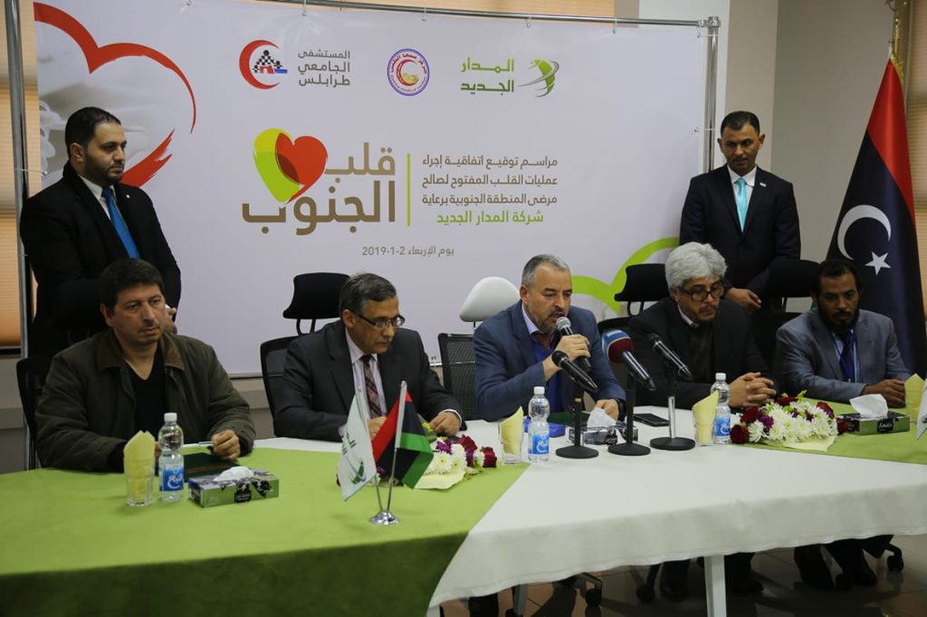 ووقع الاتفاقية المهندس عبدالخالق عاشور رئيس مجلس الإدارة بشركة المدار الجديد و الدكتور عبدالرحمن عريش مدير مركز سبها الطبي و الدكتور نبيل العجيلي مدير مستشفى الجامعي ” مركز طرابلس الطبي سابقاً ” والدكتور خالد طالب جراح قلب ورئيس الفريق الطبي لعمليات القلب المفتوح .