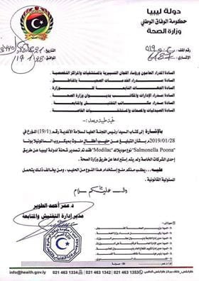 طالبت وزارة الصحة بمنع استخدام حليب أطفال نوع Modilac ملوث بميكروب السالمونيلا بونا Salmonella Poona خلال تعميم نشر على الصفحة الرسمية للوزارة حذر من خلاله مدير إدارة التفتيش والمتابعة الدكتور “عمر الطوير” وأشار فيه إلى كتاب رئيس اللجنة العليا لسلامة الأغذية بشأن التبليغ عن الحليب الملوث الذي تم توريده عن طريق إحدى الشركات الخاصة.