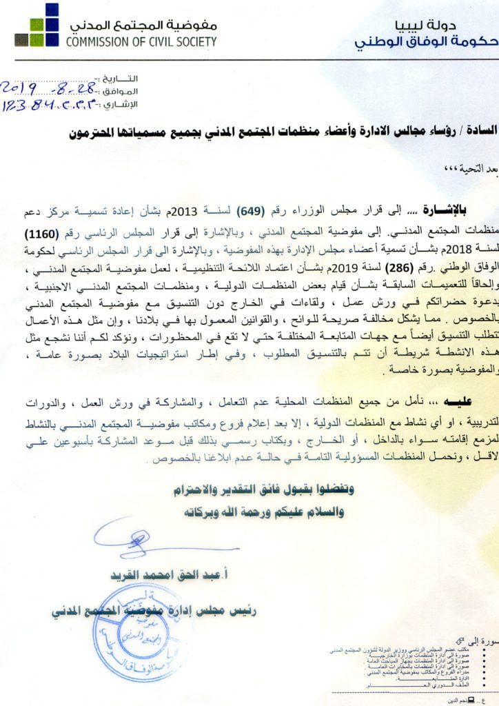 أصدر السيد عبدالحق القريد رئيس مجلس إدارة مفوضية المجتمع المدني تعميم لمنظمات المجتمع المدني بشان قيام بعض المنظمات الدولية بدعوة المنظمات المحلية إلى ورش عمل ودورات تدريبية ولقاءات بالخارج دون التنسيق مع مفوضية المجتمع المدني مما يشكل مخالفة صريحة للوائح والقوانين المعمول بها في بلادنا.