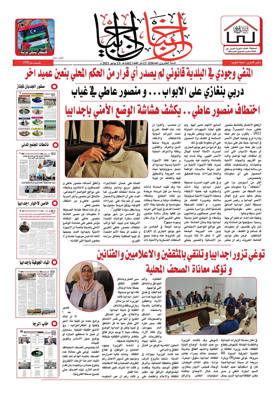 كشفت مصادر مقربة من إدارة صحيفة أخبار أجدابيا،الجمعة، عن مصادرة العدد (820) من الجريدة الصادر في 23 يونيو الجاري من…