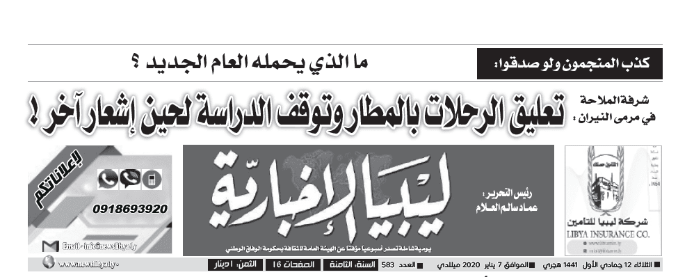 يصدر صباح الثلاثاء 24 ديسمبر 2019 العدد (581) لصحيفة #ليبيا #الإخبارية العدد كالعادة مليء بالاخبار والمتابعات واللقاءات والتحقيقات معززاً بأراء أبرز…