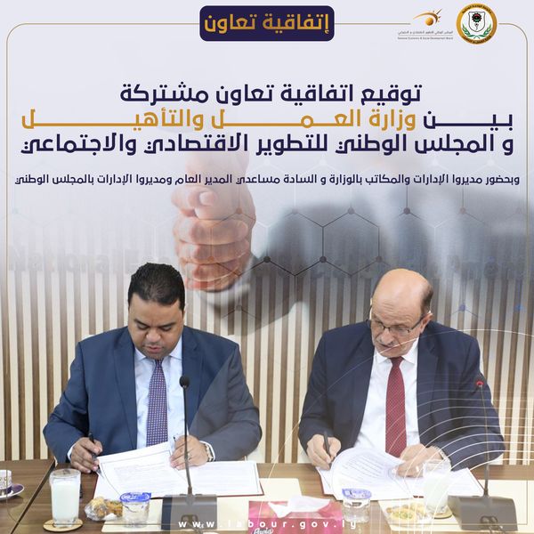 تم اليوم الثلاثاء بطرابلس توقيع اتفاقية تعاون مشترك بين وزارة العمل والتأهيل والمجلس الوطني للتطوير الاقتصادي والاجتماعي تتضمن التعاون في…