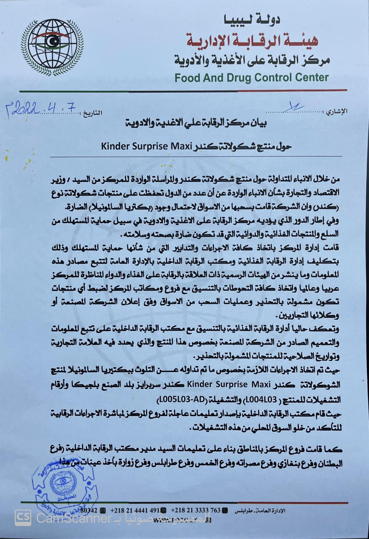 #بيان || مركز الرقابة على الأغذية والادوية حول منتج شوكلاتة #كندر (( kinder surprise Maxi )). حول ما تداول مؤخرا…
